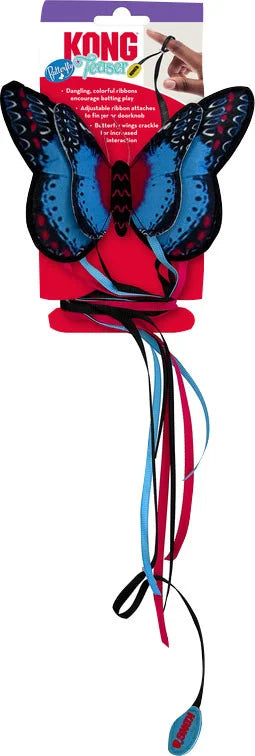 KONG Butterfly Teaser will make your cat’s heart flutter! The adjustable ribbon design offers a variety of playstyles from interactive to solo play by attaching it to your finger, a doorknob, handle, or hook. The colourful, dangling ribbons will invite swatting and chasing, while the crackling sound of the butterfly’s wings spark your cats natural prey instincts to pounce and bat. Whether you are at home or out and about, the Butterfly Teaser will keep your cat entertained and exercising throughout the day!