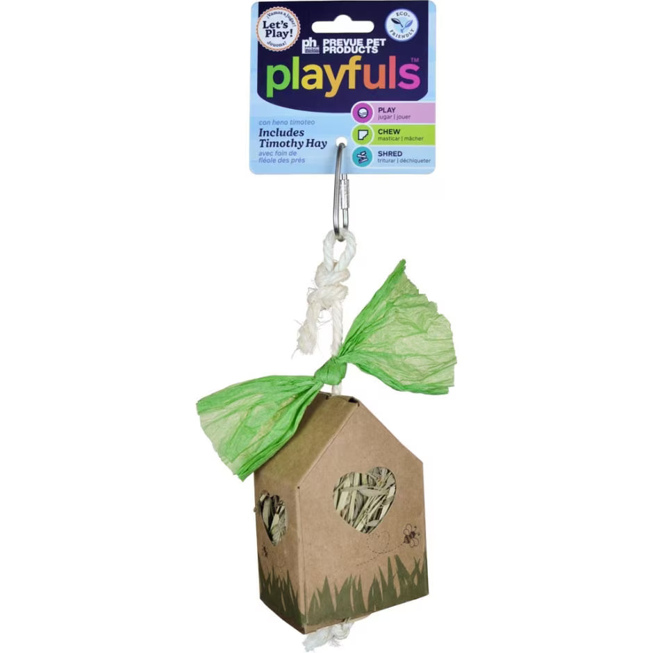 - A dangling paperboard house-shaped dispenser, stuffed to the rafters with enticing timothy hay